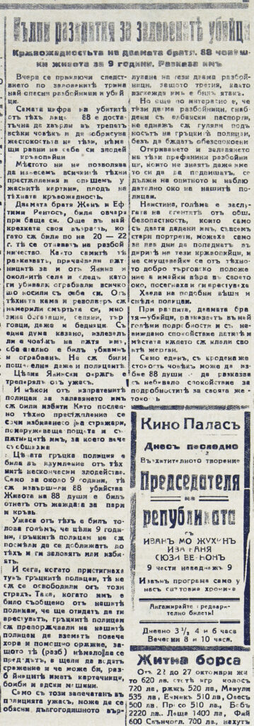 Заловени гръцки разбойници автор[и] на 88 убийства : Кръволоците спокойно търгуват във Варна. // Варненска поща (Вечерно издание) (Варна), XIII, № 3345, 28окт. 1928, с. 1.