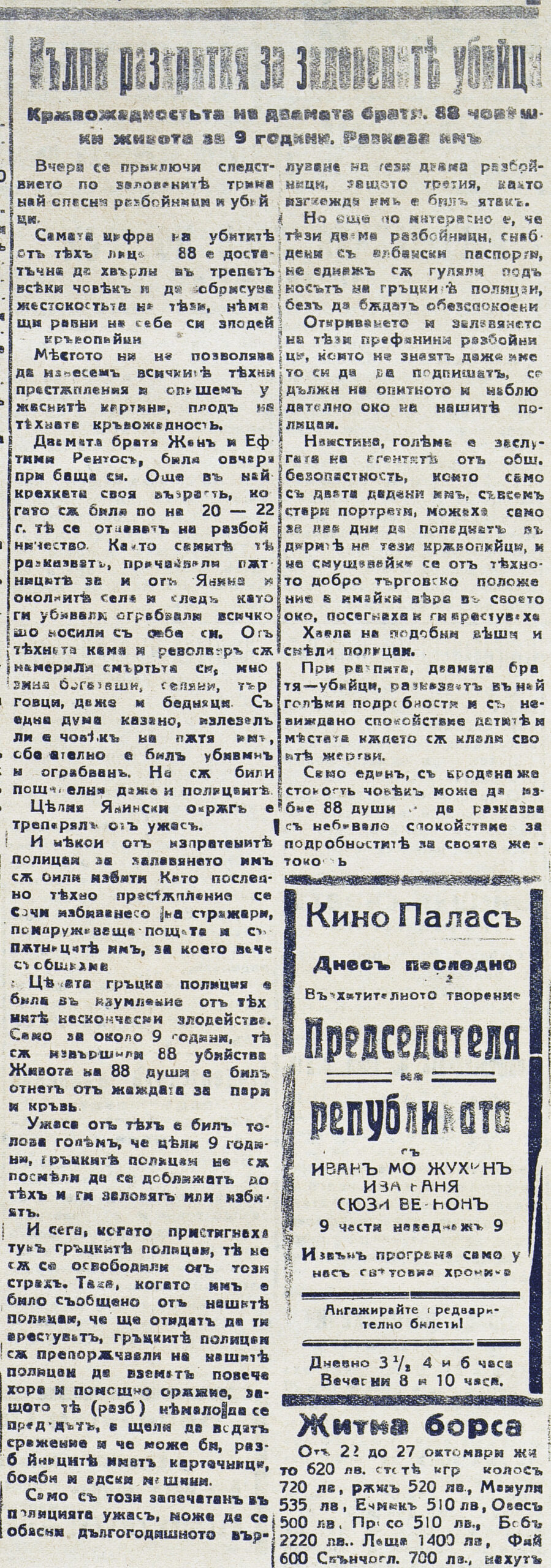 Заловени гръцки разбойници автор[и] на 88 убийства : Кръволоците спокойно търгуват във Варна. // Варненска поща (Вечерно издание) (Варна), XIII, № 3345, 28окт. 1928, с. 1.