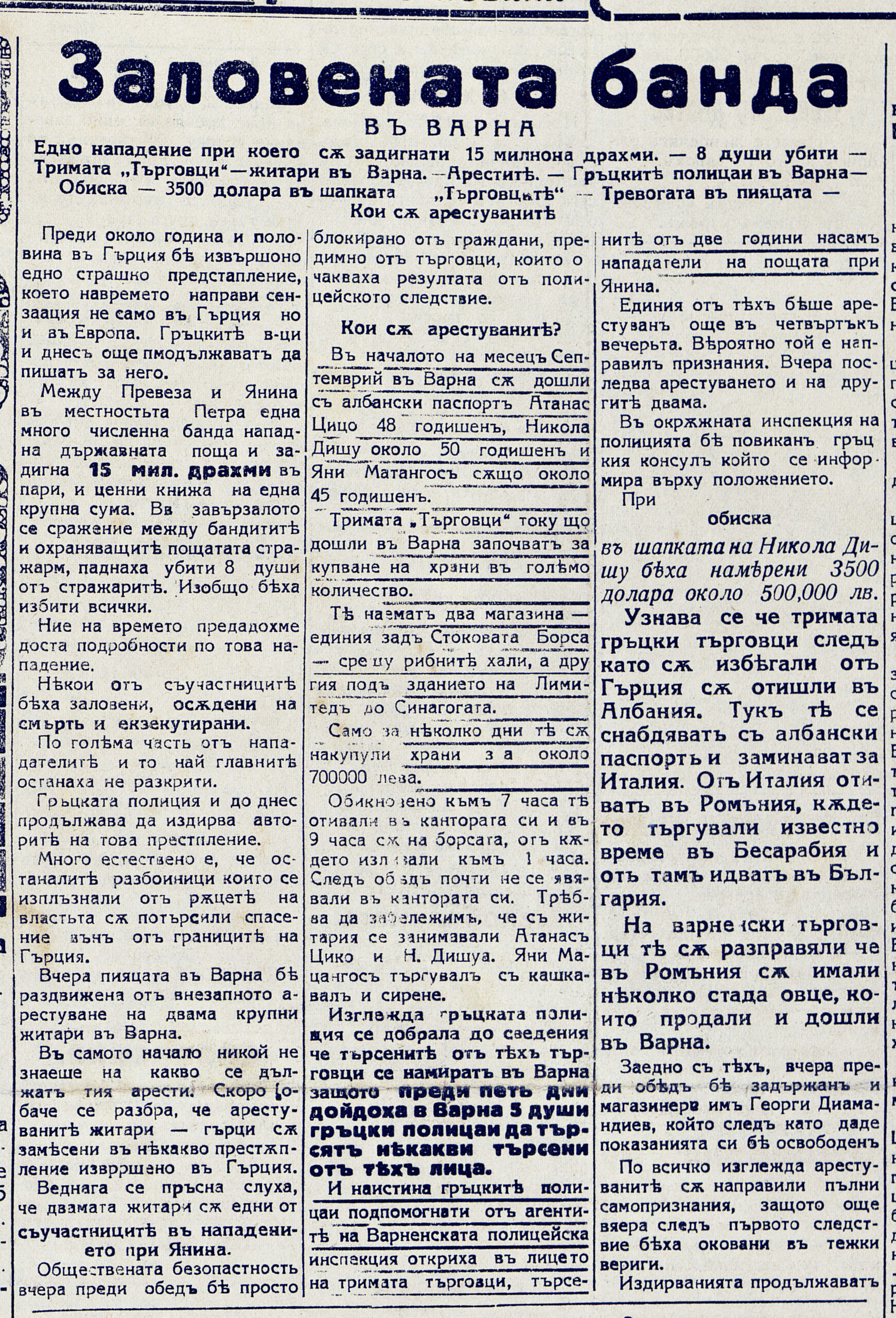 Заловената банда във Варна : Едно нападение, при което са задигнати 15 милиона драхми. 8 души убити. Тримата `търговци` – житари във Варна. Арестите. Гръцките полицаи във Варна. Обиска. 3500 долара в шапката. `Търговците`. Тревогата в пиацата. Кои са арестуваните. // Варненски новини (Варна), XVIII, № 1543, 28 окт. 1928, с. 1.