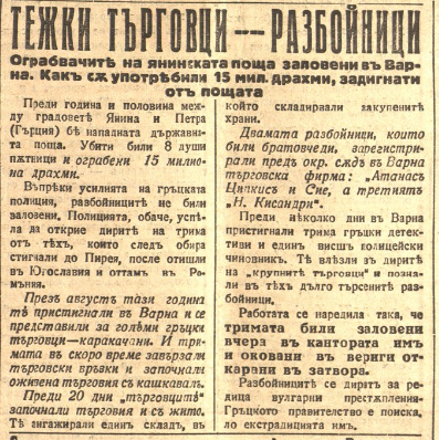 Тежки търговци – разбойници : Ограбвачите на янинската поща заловени във Варна. Как са употребили 15 мил. драхми, задигнати от пощата. // Зора, X, N 2797, 28 окт. 1928, с. 1.